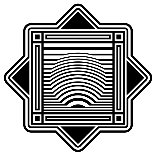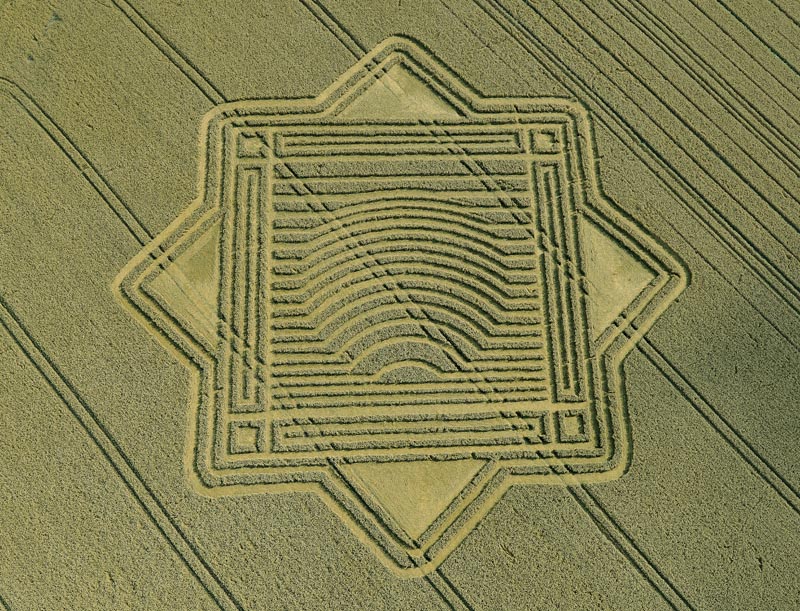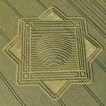 Depicts x2 2D squares with a 3D sphere protruding through the centre square with lines. This could well be an Agrogram to symbolise a holographic effect or simply a method of portraying 3D objects on a 2D canvas. The overall design resembles a CPU or QR code, where the central pattern composes the heatsink. The outer square also hints at 2D movement and the Cartesian coordinate system. Overall this pattern speaks of emergence and evolution in some way. Could this be trying to guide our future CPU design or simply to mark the evolution of human CPU design in some way?