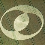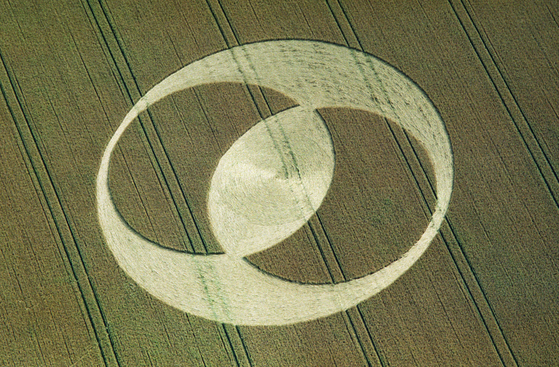 Appearing in 1996 one of the first exquisitely constructed Vesica Piscis patterns materialized overnight in a crop field in Oxfordshire near Waylands Smithy and one of the White Horse national trust sites. The Vesica Piscis is an ancient “sacred geometric” shape formed by the intersection of two identical circles. This pattern is named after the Latin for fish and often associated eye symbology when rotated, but could more scientifically represent the splitting of a cell. It frequently appears in crop circles in varying styles and as a basis for other patterns.